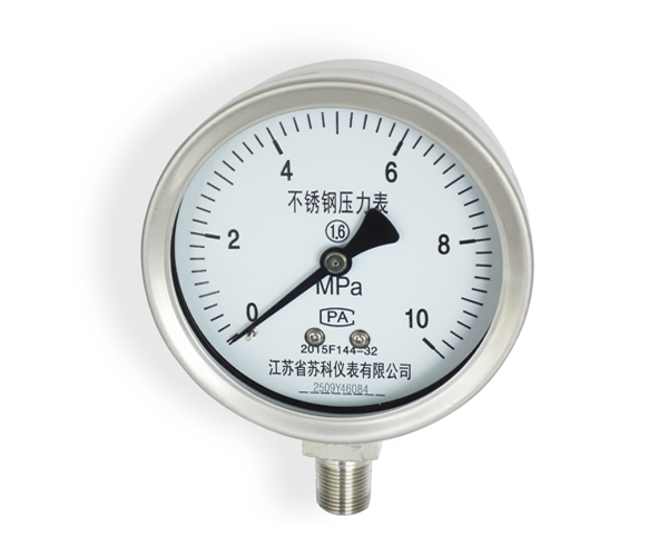 采用直接接觸式接頭和感壓元件材料,采用icr18Ni9T、Ocr18Ni12Mo2Ti、 sus316,結構為全密封型,具有較強的防被測介質腐蝕和抗環境腐蝕的能力。不銹鋼壓力表適用于腐蝕性較強的適合不銹鋼元件檢測的介質和惡劣的外部腐蝕環境中 ,不銹鋼壓力表廣泛應用于石油、化工、冶金等工業。